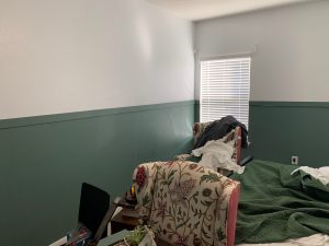 In order to cover up the dark green I had to paint several coats of white, which made me very grateful I didn’t paint my entire room. Then I painted the bottom half of the room sage green. My husband used his laser level to mark exactly how high I needed to paint on the wall, which worked a lot better than my previous method of eyeballing it.
