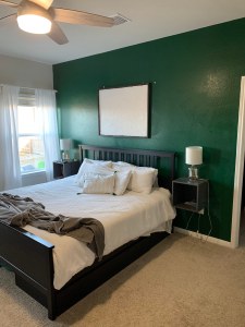 So it came to be that I decided to pick up a gallon of dark green paint and paint the wall behind my bed. This, I thought, will be amazing. Not only did I need less than a gallon of paint to complete this project, I could paint the wall in an afternoon all by myself. A win all around!